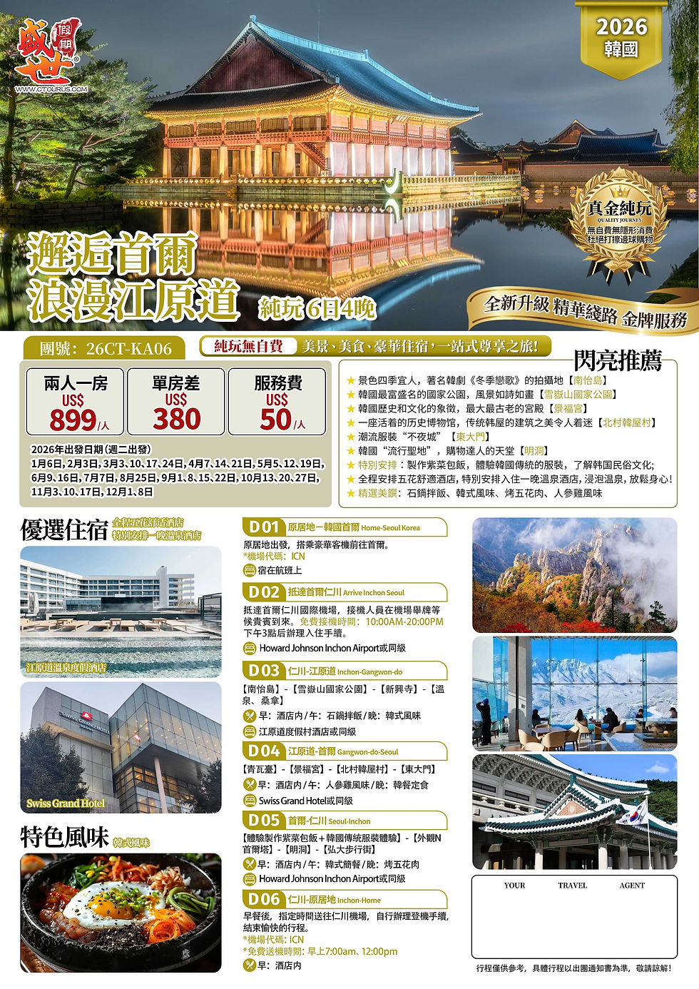 從古意盎然的景福宮殿到時尚尖端的首爾街頭,韓國完美呈現了潮流藝術、傳統禮儀與精緻生活的靈動脈搏。沉浸於充滿活力的 K-Culture 潮流,體驗充滿美學質感的宮廷料理,在古今交錯的城市景觀中感受非凡魅力。屬於您的韓流夢幻旅程,就從這裡綻放!
